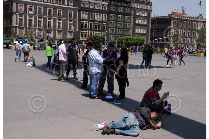 CIUDAD DE MÉXICO, 12ABRIL2019.- Un hombre duerme bajo los intensos rayos del sol en la plancha del Zócalo, mientras la sombra del asta de la bandera avanza. FOTO: ROGELIO MORALES /CUARTOSCURO.COM
