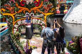 CIUDAD DE MÉXICO, 12ABRIL2019.- Horas antes a la premiación de la Flor más Bella del Ejido 2019, las participantes se reunieron en el embarcadero de Xochimilco para tomarse fotografías con los turistas y transeúntes. FOTO: ANDREA MURCIA /CUARTOSCURO.COM