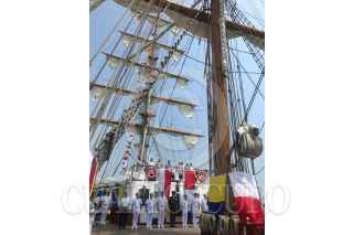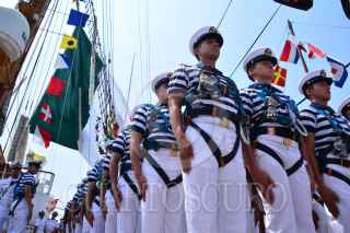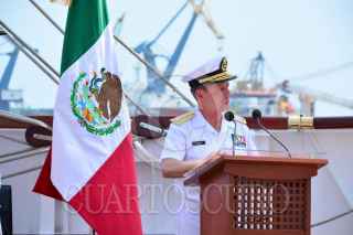VERACRUZ, VERACRUZ, 16ABRIL2019.- Esta mañana 259 tripulantes, entre ellos 24 mujeres, zarparon del muelle Turístico del puerto de Veracruz, en el Buque Escuela ARM “Cuauhtémoc” (BE-01) para dar inicio al crucero de instrucción Europa del Norte 2019, donde navegarán 226 días y visitarán 15 puertos de 11 países del mundo con la misión de estrechar los lazos de amistad del pueblo mexicano con otras naciones, así como llevar un mensaje de paz y buena voluntad en los puertos y mares del mundo, además de ceñir relaciones académicas y culturales entre Fuerzas Armadas. La ceremonia de zarpe se realizó a bordo del Buque Escuela ARM, ahí el Almirante José Rafael Ojeda Durán, Secretario de Marina y Alto Mando de la Armada de México estuvo a acompañado del General Luis Crescencio Sandoval González, Secretario de la Defensa Nacional; así como de autoridades civiles, militares y navales. FOTO: SEMAR /CUARTOSCURO.COM
