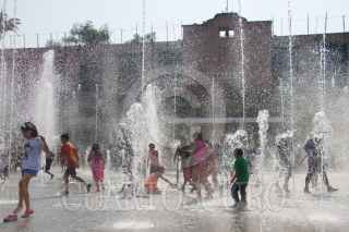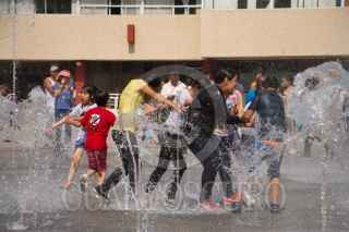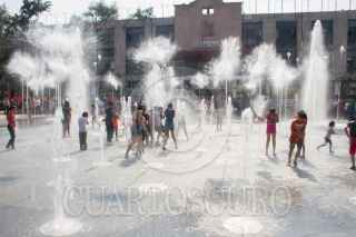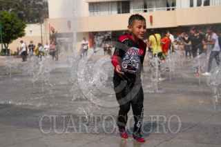 CIUDAD DE MÉXICO, 17ABRIL2019.- Niños de la alcaldía Iztacalco juegan en la fuente danzarina de la explanada de la demarcación, la cual fue reinaugurada por el alcalde Armando Quintero Martínez y el diputado Mario Delgado la mañana de este miércoles. La fuente contó con una inversión de 12 millones de pesos y permanecerá activa durante toda la Semana Santa. FOTO: ROGELIO MORALES /CUARTOSCURO.COM