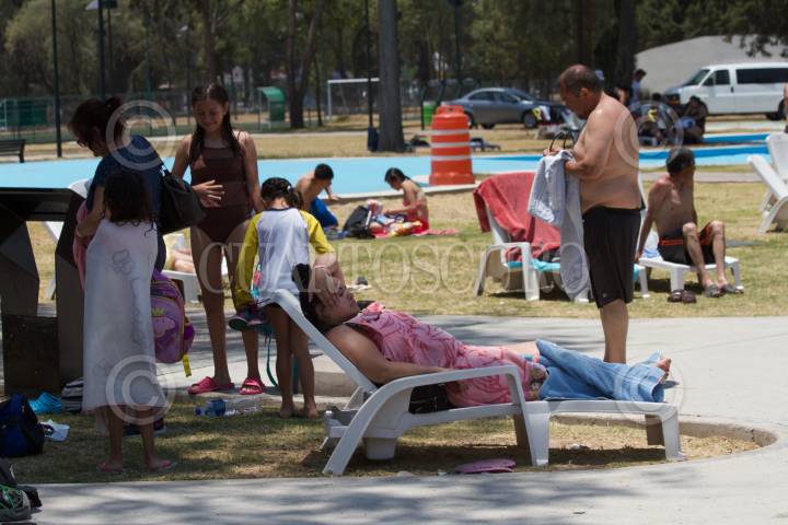 CIUDAD DE MÉXICO, 18ABRIL2019.- Un padre y su hijo pasean en bicicleta rodeando a un vendedor de juguetes bajo el intenso sol de la ciudad el cual tuvo su máxima temperatura en los 30 grados, esto en el Parque Aragón. FOTO: ROGELIO MORALES /CUARTOSCURO.COM