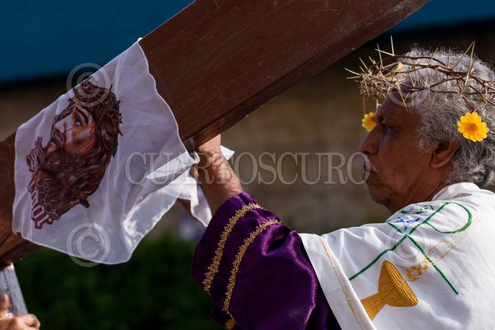 CIUDAD DE MÉXICO, 19ABRIL2019.- Con motivo de la 176 representación de la Pasión de Cristo, cientos de habitantes caracterizados de nazarenos y con cruces de madera al hombro, de más de 70 kilos, que representan los pecados y penitencias por pagar, subieron al Cerro de la Estrella como parte de los actos de la Semana Santa. FOTO: GALO CAÑAS /CUARTOSCURO.COM