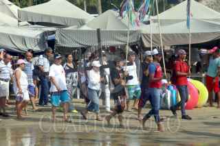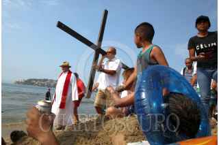 ACAPULCO, GUERRERO, 19ABRIL2019.- Turistas y feligreses participaron en el viacrucis que cada año se realiza en las playas de Acapulco. Durante su recorrido oraron por los feminicidios y la violencia en el puerto, algunos turistas que descansaban en las playas se sorprendieron por la procesión. FOTO: CARLOS ALBERTO CARBAJAL /CUARTOSCURO.COM