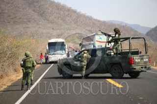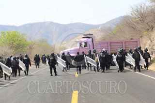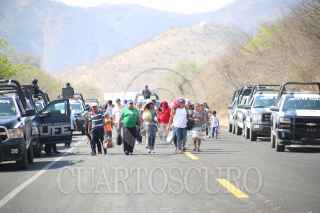 MEZCALA, GUERRERO, 23ABRIL2019.- Pobladores de la comunidad de Mezcala, Eduardo Neri bloquearon por mas de 4 horas la carretera federal Chilpancingo-Iguala para exigir castigo a los policías federales y estatales que este lunes en la noche se metieron a una vivienda y golpearon a un señor, un joven y a una mujer a quienes además les robaron sus teléfonos celulares, y por lo cual agentes de la Policía Estatal desalojaron a habitantes de esta comunidad y posteriormente detuvieron a cuatro personas, entre las cuales un menor de edad que participaban en la protesta. Luego del desalojo, hombres armados escondidos desde un cerro hicieron dos disparos al parecer de escopeta calibre 22 lo que motivó que varias patrullas de la Policía Estatal ingresaran a esta localidad de Mezcala sin lograr la detención de los agresores. FOTO: EDUARDO GUERRERO /CUARTOSCURO.COM