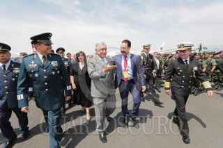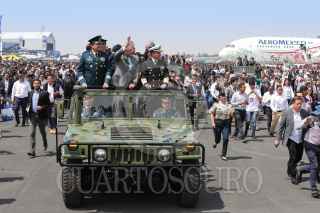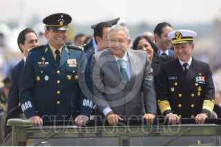 SANTA LUCÍA, ESTADO DE MÉXICO, 24ABRIL2019.- Luis Cresencio Sandoval González, Secretario de la Defensa; Andrés Manuel López Obrador, Presidente de México, y José Rafael Ojeda Durán, secretario de Marina, durante la inauguración de la Feria Aeronaval México 2019, en la base militar de Santa Lucía. FOTO: PRESIDENCIA /CUARTOSCURO.COM