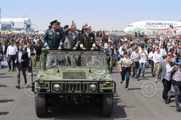 SANTA LUCÍA, ESTADO DE MÉXICO, 24ABRIL2019.- Luis Cresencio Sandoval González, Secretario de la Defensa; Andrés Manuel López Obrador, Presidente de México, y José Rafael Ojeda Durán, secretario de Marina, durante la inauguración de la Feria Aeronaval México 2019, en la base militar de Santa Lucía. FOTO: PRESIDENCIA /CUARTOSCURO.COM