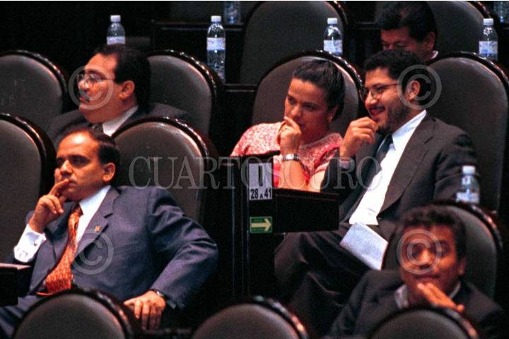 El coordinador de la fraccion parkamentaria del PAN en la Cámara de Diputados, Felipe Calderón Hinojosa, platica con sus compañeros mientras el secretario de Desarrollo Social Carlos Jarque rendía su informe dentro de la glosa del último informe del presidente Zedillo. FOTO: Pedro Mera/CUARTOSCURO.COM