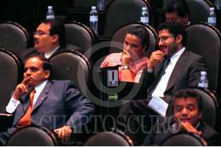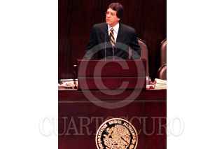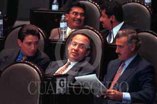 El coordinador de la fraccion parkamentaria del PAN en la Cámara de Diputados, Felipe Calderón Hinojosa, platica con sus compañeros mientras el secretario de Desarrollo Social Carlos Jarque rendía su informe dentro de la glosa del último informe del presidente Zedillo. FOTO: Pedro Mera/CUARTOSCURO.COM