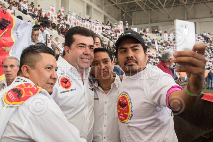 CIUDAD DE MÉXICO 28ABRIL2019.- Ricardo Monreal, líder de los senadores de Morena; José del Olmo, secretario de la CATEM en la Ciudad de México, y Pedro Haces Barba, secretario general de la Confederación Autónoma de Trabajadores y Empleados de México (CATEM), al finalizar la ceremonia en la cual "Pepe" del Olmo tomo protesta junto con otros líderes para presidir el consejo director de esta organización en la capital. FOTO: MOISÉS PABLO /CUARTOSCURO.COM