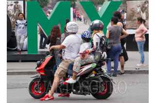 CIUDAD DE MÉXICO, 28ABRIL2019.- Familia a bordo de una motoneta se toma una selfye, frente a la plaza de la Constitución de la Ciudad. Cabe destacar que pese al cierre parcial de las calles aledañas al Zócalo, motociclistas evaden las vallas policiacas y circulan por la zona peatonal. FOTO: ROGELIO MORALES /CUARTOSCURO.COM