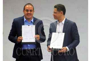 CUERNAVACA, MORELOS, 29ABRIL2019.- El gobernador Cuauhtémoc Blanco Bravo y Cesar Emiliano Hernández Ochoa, Comisionado Nacional de Mejora Regulatoria, durante la firma entre el gobierno de Morelos y el organismo encargado de impulsar la mejora regulatoria en el país. FOTO: MARGARITO PÉREZ RETANA /CUARTOSCURO.COM