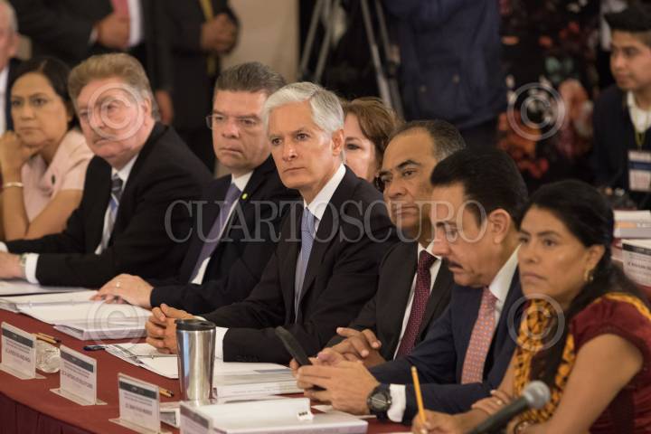CIUDAD DE MÉXICO, 30ABRIL2019.- María Luisa Albores García, Secretaria de Bienestar; Olga Sánchez Cordero, secretaria de Gobernación, y Jorge Alcocer Varela, secretario de Salud, conversan durante la ceremonia de instalación del Sistema de Protección Integral de los Derechos de las Niñas, Niños, y Adolescentes, realizado en las instalaciones de la Segob. En la imagen el gobernador de Hidalgo, Omar Fayad, se despide la Sánchez Cordero. FOTO: MOISÉS PABLO /CUARTOSCURO.COM
