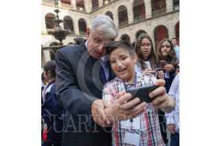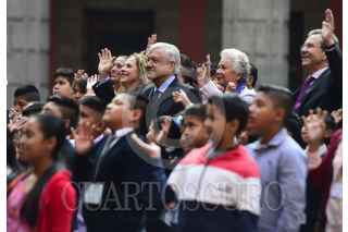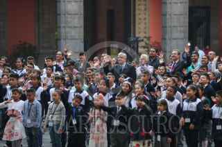 CIUDAD DE MÉXICO, 30ABRIL2019.- Andrés Manuel López Obrador, Presidente de México, acompañado por su esposa Beatriz Gutiérrez Müller, celebraron el Día Internacional de la Infancia, en el patio central del Palacio Nacional, ahí convivieron alumnos de varias escuelas primarias. Los acompañaron la secretaria de Gobernación, Olga Sánchez Cordero, y Esteban Moctezuma, secretario de Educación Pública. FOTO: PRESIDENCIA /CUARTOSCURO.COM
