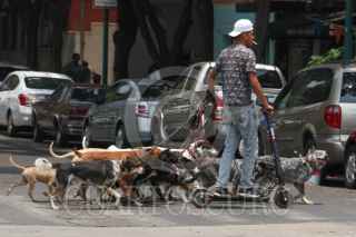 CIUDAD DE MÉXICO, 30BRIL2019.- Paseador de perros, aprovecha el remolque de los perros para impulsar su monopatín, sobre avenida Chapultepec. FOTO: ROGELIO MORALES /CUARTOSCURO.COM