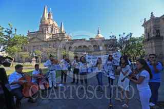 GUADALAJARA, JALISCO, 02MAYO2019.- Familiares, músicos y amigos del joven Violinista Ángel García Trejo, quien era concertista con la Orquesta Filarmónica Juvenil de Guadalajara, se concentraron en esta mañana en Plaza de Armas en el centro de la ciudad para manifestar su descontento por la desaparición del músico. FOTO: FERNANDO CARRANZA GARCIA / CUARTOSCURO.COM