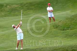 HUIXQUILICAN, EDO. MEX. 05MARZO2005- La golfista coreana Anne Song golpea la bola para sacarla de una trampa, durante su participación en el Primer Abierto Mexicano Femenil que se lleva a cabo en BosqueReal. FOTO: Cecilia del Olmo/CUARTOSCURO.COM