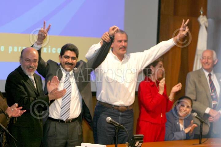 MEXICO, D.F. 05MARZO2005.- Vicnte Fox Quesada, presidente de los Estados Unidos Mexicanos, felicitó a Manuel Espino por haber resultado electo como nuevo presidente nacional del Partido Acción Nacional. En la gráfica Luis Felipe Bravo Mena y Marta Sahagún de Fox. FOTO: Iván Stephens/CUARTOSCURO.COM