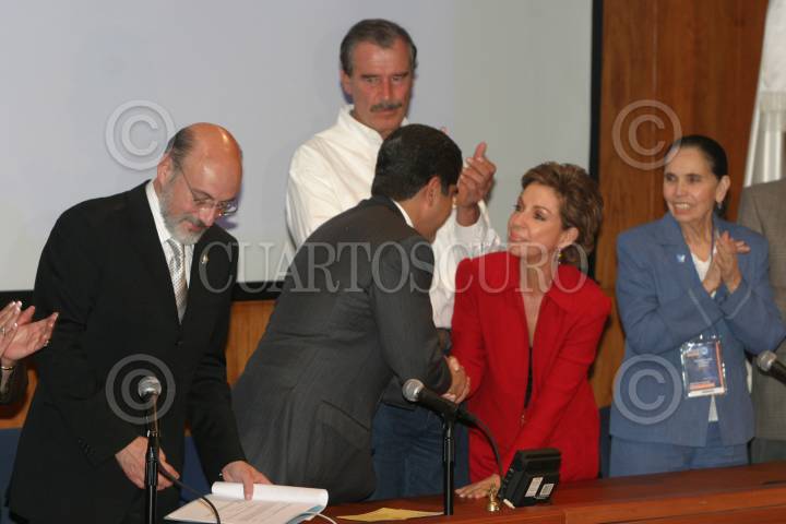 MEXICO, D.F. 05MARZO2005.- Vicnte Fox Quesada, presidente de los Estados Unidos Mexicanos, felicitó a Manuel Espino por haber resultado electo como nuevo presidente nacional del Partido Acción Nacional. En la gráfica Luis Felipe Bravo Mena y Marta Sahagún de Fox. FOTO: Iván Stephens/CUARTOSCURO.COM