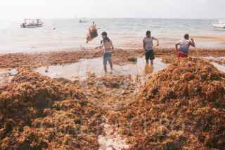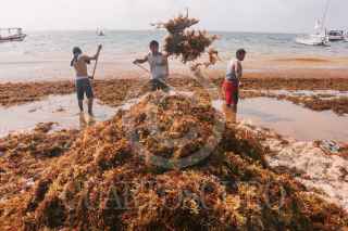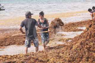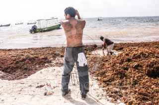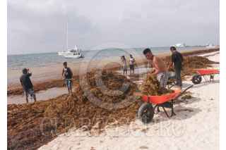 CANCÚN, QUINTANA ROO, 06MAYO2019.- El estado de Quintana Roo implementó el protocolo emergente para la atención de sargazo en el estado participan, iniciativa privada, gobierno federal y municipales. En la imagen infractores ayudan con recoger esta macroalga. FOTO: ELIZABETH RUIZ /CUARTOSCURO.COM
