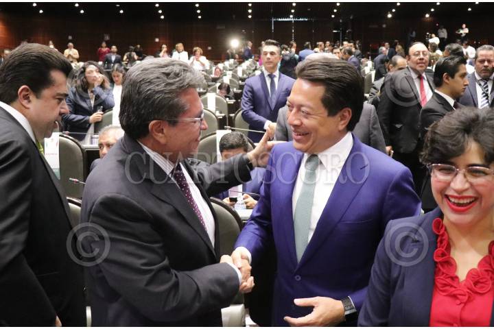 CIUDAD DE MÉXICO, 08MAYO2019.- Mario Delgado, coordinador de los diputados de Morena, y Martí Batres, presidente del Senado, al finalizar la sesión del Congreso General del Poder Legislativo, en la cual se acordó un periodo extraordinario para sacar la Reforma Educativa y las Leyes Reglamentarias de la Guardia Nacional. FOTO: CUARTOSCURO.COM