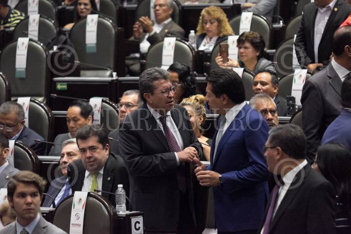 CIUDAD DE MÉXICO, 08MAYO2019.- Mario Delgado, coordinador de Morena y Martí Batres, presidente de la mesa directiva en el Senado, posaron para la foto al termino de la instalación de la Sesión Extraordinaria en materia de Reforma Educativa en el pleno de la Cámara de Diputados. FOTO: GRACIELA LÓPEZ /CUARTOSCURO.COM