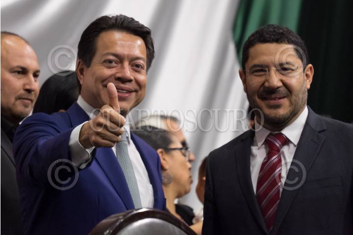 CIUDAD DE MÉXICO, 08MAYO2019.- Mario Delgado, coordinador de Morena y Martí Batres, presidente de la mesa directiva en el Senado, posaron para la foto al termino de la instalación de la Sesión Extraordinaria en materia de Reforma Educativa en el pleno de la Cámara de Diputados. FOTO: GRACIELA LÓPEZ /CUARTOSCURO.COM