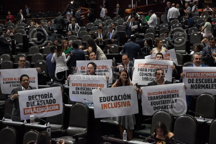 CIUDAD DE MÉXICO, 08MAYO2019.- Integrantes del partido de Movimiento Ciudadano protestaron con pancartas para posicionarse en contra de la aprobación de la Reforma Educativa en la Segunda parte de la Sesión Extraordinaria en la Cámara de Diputados. FOTO: GRACIELA LÓPEZ /CUARTOSCURO.COM