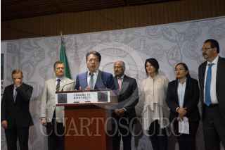 CIUDAD DE MÉXICO, 08MAYO2019.- Tonatiuh Bravo Padilla, coordinador del partido de Movimiento Ciudadano, Mario Delgado, coordinador de la bancada de Morena y René Juárez Cisneros, coordinador del Partido Revolucionario Institucional (PRI) al termino de la conferencia de prensa en la que informaron sobre los puntos de acuerdo de la aprobación de reformar los artículos 3 y 73 en materia educativa de la segunda parte en la Sesión Extraordinaria en la Cámara de Diputados. FOTO: GRACIELA LÓPEZ /CUARTOSCURO.COM