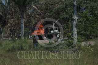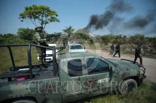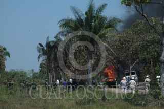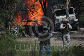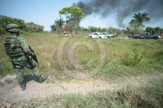 REFORMA, CHIAPAS, 09MAYO2019.- En el ejido Rafael Pascacio Gamboa efectivos de la SEDENA y personal de PEMEX resguardaron y acordonan la zona de siniestro del pozo petrolero que explotó cuando sujetos desconocido realizaban sustracción ilegal del producto. En el área se observa un camión tipo tortón y una camioneta tipo silverado, ambas consumidas por las llamas; las autoridades no han precisado si hubo personas fallecidas, heridas o si hubo detenidos por los hechos. FOTO: EDGAR JASSO /CUARTOSCURO.COM