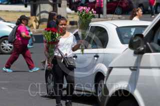 CIUDAD DE MÉXICO, 10MAYO2019.- Una vendedora de rosas junto a sus hijos espera el cambio de luz del semáforo para comenzar la venta de ramos de rosas en el Día de las Madres , en el cual se espera una derrama económica de cerca de 47 millones de pesos. FOTO: ROGELIO MORALES /CUARTOSCURO.COM