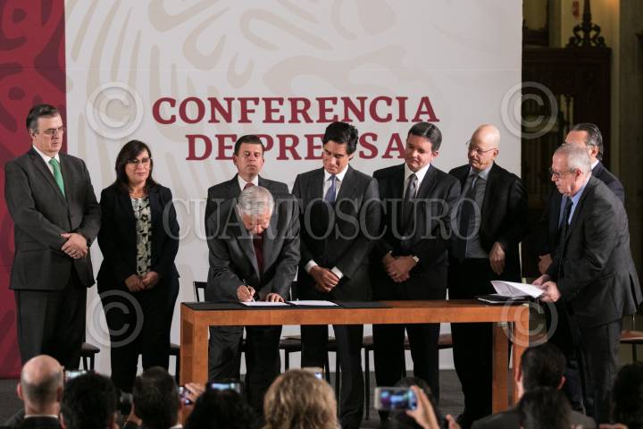 CIUDAD DE MÉXICO, 13MAYO2019.- Andrés Manuel López Obrador, presidente de México, durante la conferencia de prensa donde se firmó el decreto por ocho mil millones de pesos con las instituciones bancarias HSBC, Mitzuho Securities y J.P. Morgan para fortalecer las finanzas de PEMEX. FOTO: GALO CAÑAS /CUARTOSCURO.COM
