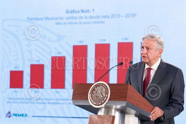 CIUDAD DE MÉXICO, 13MAYO2019.- Andrés Manuel López Obrador, presidente de México, durante la conferencia de prensa donde se firmó el decreto por ocho mil millones de pesos con las instituciones bancarias HSBC, Mitzuho Securities y J.P. Morgan para fortalecer las finanzas de PEMEX. FOTO: GALO CAÑAS /CUARTOSCURO.COM