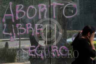 CIUDAD DE MÉXICO, 13MAYO2019.- En la imagen una pinta en una puerta de avenida Reforma con la leyenda "Aborto libre y seguro", en la capital existe desde hace doce años la Interrupción Legal del Embarazo (ILE), antes de las doce semana de gestación, sin embargo, existen estados como el de Nuevo León que penaliza con cárcel a las mujeres que lo practiques. FOTO: MOISÉS PABLO /CUARTOSCURO.COM