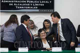 CIUDAD DE MÉXICO, 13MAYO2019.- Francisco Chiguil, alcalde de Gustavo A. Madero (GAM), se despide de María Guadalupe Chavira de la Rosa, presidenta de la Comisión de Administración Pública y del diputado Víctor Hugo Lobo Román al finalizar su comparecencia en el Congreso Local. FOTO: GRACIELA LÓPEZ /CUARTOSCURO.COM