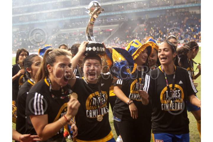 MONTERREY, NUEVO LEÓN, 13MAYO2019.- Jugadoras del equipo de Tigres Femenil, levantan la copa al ganar de visitante 2 goles por 1 ante el equipo de las Rayadas del Monterrey, en el estadio BBVA Bancomer en la Liga MX Femenil, Clausura 2019. Marcador Global: Monterrey: 2 - Tigres: 3 FOTO: GABRIELA PÉREZ MONTIEL / CUARTOSCURO.COM