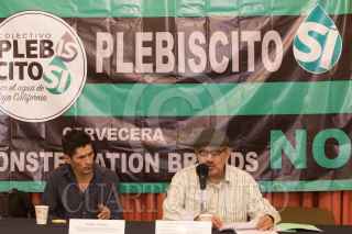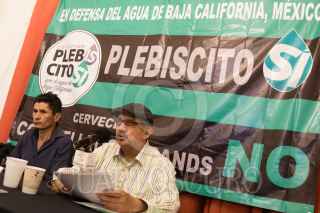 CIUDAD DE MÉXICO, 14MAYO2019.- Sergio Campa y Carlos Alfonso Escobar, representantes del Colectivo Plebiscito por la Defensa del Agua de Baja California, ofrecieron una conferencia de prensa para hablar sobre la solicitud que le hicieron al Instituto Estatal Electoral de Baja California (IEEBC) para que se realice un plebiscito a nivel estatal en el que se consulte a la ciudadanía si está o no de acuerdo con la aprobación de la Manifestación de Impacto Ambiental (MIA) que otorgó el gobierno estatal a Constellation Brands, para que instale una planta cervecera en Mexicalli. La propuesta esta respaldada por 18 mil firmas y es necesaria para que los bajacalifornianos expresen su opinión sobre una empresa que acaparará el agua potable, recurso escaso en la entidad. FOTO: MOISÉS PABLO /CUARTOSCURO.COM