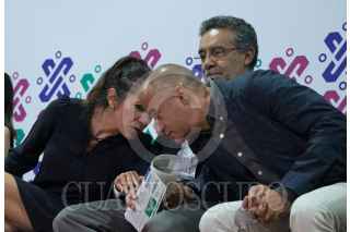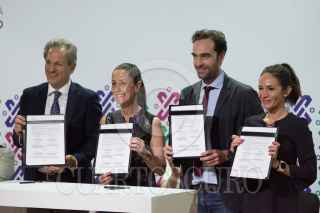 CIUDAD DE MÉXICO, 15MAYO2019.- Antonio del Valle Perochena, presidente de Grupo Kaluz; Claudia Sheinbaum, jefa de Gobierno; Andrés Lajous Loaeza, secretario de Movilidad y Dunia Ludlow Deloya, Coordinadora General de la Autoridad del Centro Histórico, firmaron un convenio durante la presentación del Inicio de obra en el Barrio de Santa María la Redonda y el proyecto en Avenida Hidalgo en la Escuela del Ballet Folklórico de México de Amalia Hernández, ubicada en la Colonia Guerrera, alcaldía Cuahtémoc. FOTO: GRACIELA LÓPEZ /CUARTOSCURO.COM