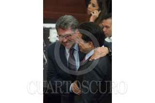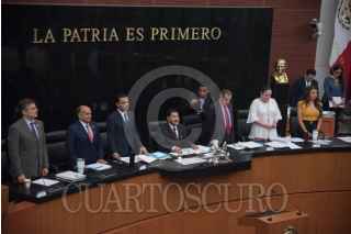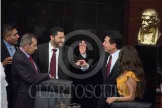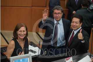 CIUDAD DE MÉXICO, 15MAYO2019.- La Comisión Permanente del Congreso de la Unión realizó esta tarde la declaratoria de validez de la nueva reforma educativa de los artículos 3, 31 y 73 de la Constitución en materia de Reforma Educativa. En la imagen, Tatiana Clouthier, diputada de Morena, junto a Ricardo Monreal, y Mario Delgado, coordinadores de Morena en Senado y Diputados respectivamente, celebran la declaratoria de la reforma. FOTO: MARIO JASSO /CUARTOSCURO.COM