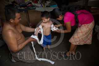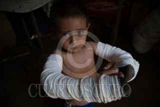 LAGUNA LARGA, CAMPECHE, 16MAYO2019.- Un menor de edad habitante del Campamento de Desplazados de Laguna Larga, instalado en la frontera entre México y Guatemala desde junio del 2017, se fracturo ambos codos luego de caer desde un puente de 8 metros de altura que se encuentra a la salida del poblado mexicano El Desengaño. El accidente ocurrió el 4 de marzo mientras el menor acompañaba a su padre, Luis Alfonso Hermosilla Lemus, a comprar algunos víveres para llevar al campamento, en un descuido el niño tropezó perdiendo el equilibrio y cayó del puente sobre las piedras del arrollo. El menor fue atendido en el hospital del municipio de Candelaria y posteriormente trasladado al Hospital General de Especialidades de la ciudad de Campeche para realizar la operación correspondiente. Hermosilla Lemus comenta que hasta el momento no le han retirados los clavos pues al acudir a su cita programada el 3 de mayo le notificaron que nadie los podía atender ya que los doctores se encontraban de vacaciones. FOTO: MARTÍN ZETINA /CUARTOSCURO.COM