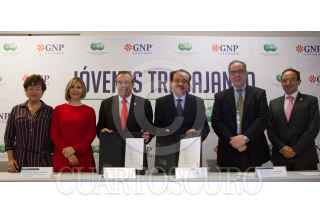 CIUDAD DE MÉXICO, 20MAYO2019.- María Eugenia Garcia, Directora General del Instituto Mexicano de Teleservicios; Luz Hiram Morales, Directora General de Delegaciones de la CONDUSEF; Eduardo Silvina Pylypciow, Director General de GNP Seguros; Oscar Rosado Jimenénez, Presidente de la CONDUSEF; Roberto Tejero Castañeda, Vicepresidente de delegaciones de la CONDUSEF y Manuel Básica Álvarez; Director de Recursos Humanos de GNP seguros, durante el lanzamiento del programa, "Jóvenes Trabajando", el cual es impulsado por el convenio entre la CONDUSEF y GNP Seguros y tiene como objetivo incentivar a jóvenes que realizan sus pasantías dentro de la institución y con la posibilidad de quedarse a trabajar al termino de sus estudios. FOTO: ROGELIO MORALES /CUARTOSCURO.COM