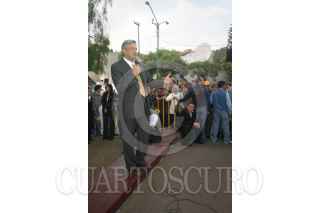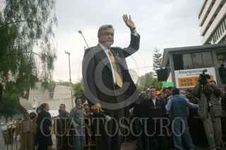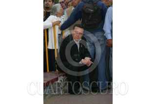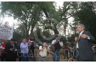 MEXICO, D.F 14ABRIL2005.- Nicolás Mollinedo Bastar, escucha a López Obrador, durante la conferencia que ofreciò a los medios de comunicaciòn en un parque cerca de su casa. FOTO: Nelly Salas/CUARTOSCURO.COM