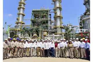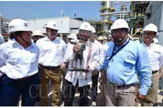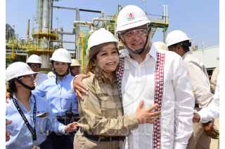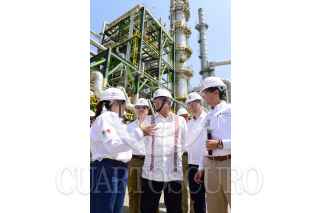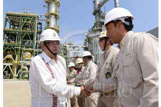 SALAMANCA, GUANAJUATO, 26MAYO2019. Andrés Manuel López Obrador, Presidente de México, encabezó la presentación del Plan Nacional de Refinación en las instalaciones de la refinería ‘Ingeniero Antonio Manuel Amor Ríos’, en la cual realizó un recorrido por las instalaciones de la misma. Lo acompañan, la secretaría de energía, Rocío Nahle; el director de PEMEX, Octavio Oropeza y el gobernador de Guanajuato, Diego Sinhue Rodríguez Vallejo. FOTO: PRESIDENCIA /CUARTOSCURO.COM