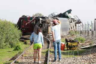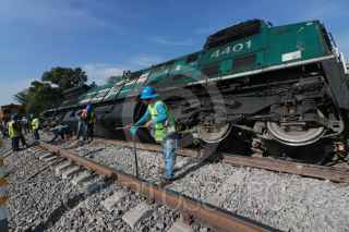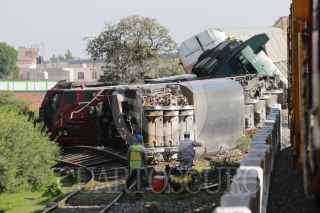 APIZACO, TLAXCALA, 27MAYO2019.- La madrugada del lunes un tren que transportaba vehículos, sufrió un descarrilamiento en las inmediaciones del municipio de Apizaco en el paraje conocido como “La cartonera”. Dos maquinas férreas y un vagón quedaron recostados sobre las vías del tren, durante el percance 2 personas resultaron con lesionadas, así mismo el incidente causó daños materiales y que esa importante vía de comunicación quedará completamente cerrada. Elementos de la Gerdamería y la Policía Estatal implementaron un operativo de vigilancia y seguridad, en espera del personal de Ferrosur e iniciar las maniobras para la liberación de las vías férreas. FOTO: JOAQUÍN SANLUIS /CUARTOSCURO.COM