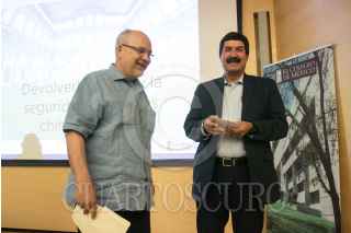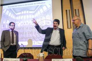 CIUDAD DE MÉXICO, 27MAYO2019.- Javier Corral, gobernador de Chihuahua, encabezó la ponencia "La seguridad en Chihuahua", en el Colegio de México. En la imagen, con el investigador Lorenzo Meyer. FOTO: ISAAC ESQUIVEL /CUARTOSCURO.COM