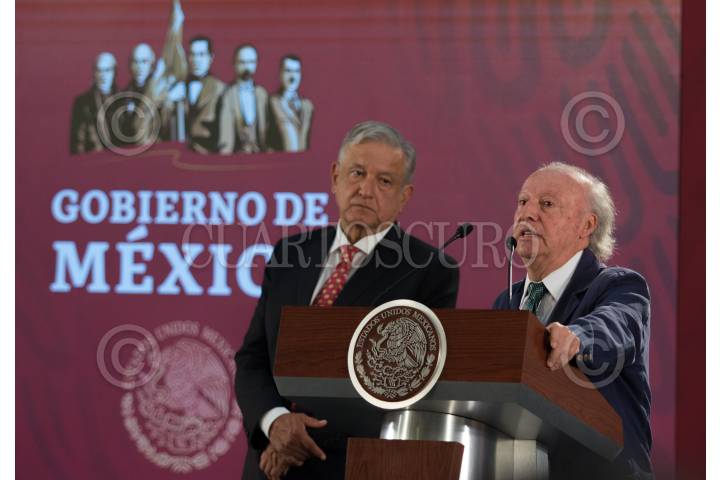 CIUDAD DE MÉXICO, 29MAYO2019.- El presidente de la República Andrés Manuel López Obrador y Víctor Manuel Toledo, secretario de Medio Ambiente y Recursos Naturales, durante la conferencia matutina para dar detalles sobre la Iniciativa Spotlight que pretende eliminar los feminicidios en México. FOTO: ANDREA MURCIA /CUARTOSCURO.COM