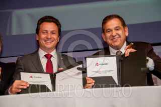 CIUDAD DE MÉXICO, 29MAYO2019.- Imagen correspondiente al 12 de septiembre de 2013, en la cual Emilio Lozoya, quien en aquellos días estaba al frente de Pemex, y Alonso Ancira, presidente de la empresa Altos Hornos de México (AHMSA) y en aquel año se desempeñaba también como presidente de Canacero, encabezaban una firma de convenio para la adquisición de productos siderúrgicos producidos en México entre Canacero y Pemex. Hoy ambos tienen orden de aprehensión el primero sigue prófugo y el segundo fue detenido en España, son acusados de haber dañado el patrimonio de Pemex por más de 600 millones de pesos, en la adquisición de la compra de la planta Agro Nitrogenados propiedad de AHMSA, una empresa de fertilizantes que tenía 14 años sin operar y con equipos de 30 años de antigüedad, por la que pago la paraestal cerca de 475 millones de dólares, esta operación se habría realizado en 2014. La Unidad de Investigación Financiera de la SHCP dio a conocer qué AHMSA realizó varios pagos a Lozoya Austin a través de unas cuentas de una empresa fantasma ligada al caso Odebrecht. FOTO: ARCHIVO JUAN PABLO ZAMORA /CUARTOSCURO.COM