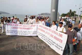ACAPULCO, GUERRERO, 30MAYO2019.- Integrantes de diferentes organizaciones gremiales y sindicales marcharon por la avenida costera Miguel Alemán, para exigir transparencia en el manejo del FOVISSSTE, entre otras demandas relacionadas con el alto costo que deben cubrir trabajadores por un crédito de vivienda. Los manifestantes exigieron la devolución de los intereses de los ahorros, y apoyo a las reformas a la ley del ISSSTE, sobre el cobro de crédito de vivienda, y la eliminación de la actualización anual de los créditos del FOVISSTE. FOTO: BERNANDINO HERNÁNDEZ /CUARTOSCURO.COM