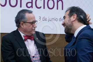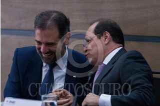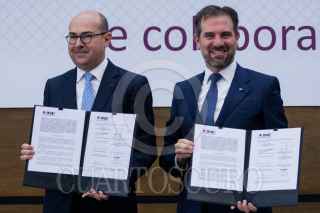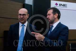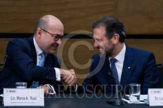 CIUDAD DE MÉXICO, 03JUNIO2019.- Marco A. Ruiz, presidente del Consejo del Colegio de Notarios de la Ciudad de México, y Lorenzo Córdova Vianello, consejero presidente del Instituto Nacional Electoral (INE), durante firma de convenio entre INE y dicha institución para la verificación de información electoral en procesos notariales. FOTO: GALO CAÑAS /CUARTOSCURO.COM