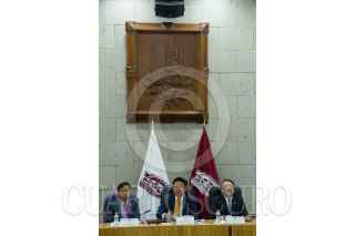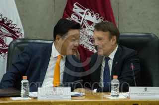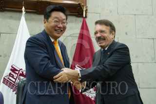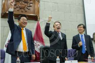 CIUDAD DE MÉXICO, 03JUNIO2019.- Hyunghwan Joo, Ministro de Comercio Industrial y Energía de la República de Corea y Mario Alberto Rodríguez Casas, Director General del IPN; durante la foto oficial de la presentación del Informe Final del Programa de Conocimiento Compartido con México (Knowledge Sharing Program –KSP–) de la República de Corea del Sur y el IPN en la sala de del Consejo General Consultivo de la unidad profesional Adolfo López Mateos. FOTO: ROGELIO MORALES /CUARTOSCURO.COM
