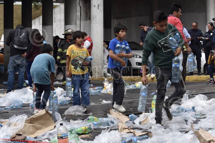 TOLUCA, ESTADO DE MÉXICO, 04JUNIO2019.- Después de registrarse el choque de un trailer con transportaba aguas y refrescos, con el tren en Paseo Tollocan y avenida Comonfort, la gente que pasaba por el lugar, trabajadores y vecinos de la zona se llevaron el producto que quedó regado en el lugar, algunos llegaron con bolsas de mandado, carretillas o cajas de plástico para poder llevarse todo lo que pudieran. FOTO: CRISANTA ESPINOSA AGUILAR /CUARTOSCURO.COM